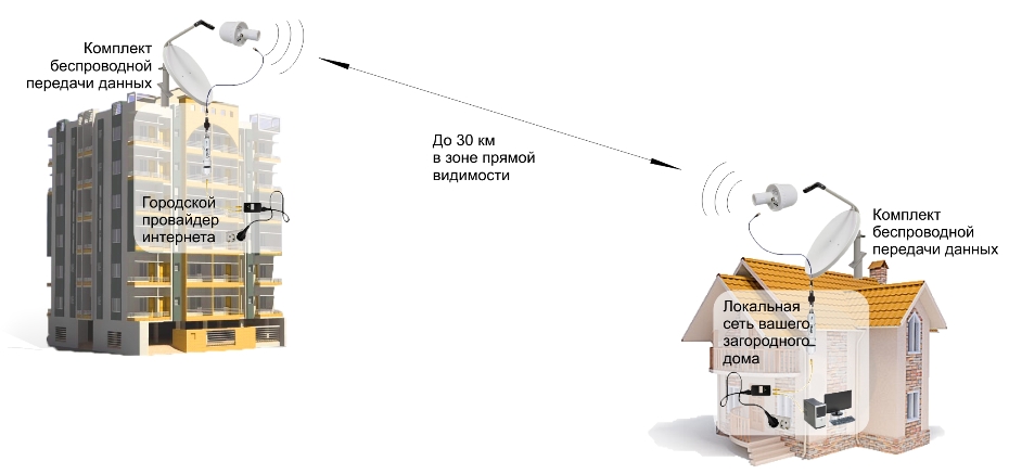 3. Передача интернета по радиоканалу на расстояние до 30 км.Этот способ возможен, если в зоне прямой видимости от вашего загородного дома есть объект (жилой многоквартирный дом, офисный центр и пр.) с проводным скоростным доступом в интернет. При этом наличие прямой видимости является обязательным условием! |