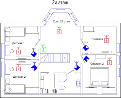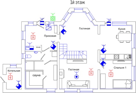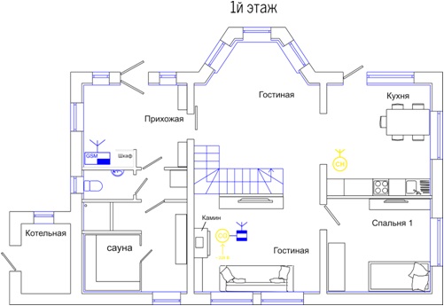 Датчики устанавливались во все помещения дома, кроме помещений с "мокрыми процессами". Кол-во датчиков и места установок выбирались согласно действующим пожарным нормам (СП 5.13130.2009)